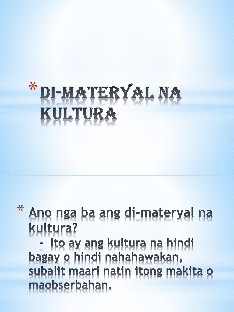 Mga di materyal na bagay. Materyal man o di-materyal. Sampung kabataan ang naging kalahok at isinagawa sa Baranggay Ardemil Sara Iloilo. Kulturang Di materyal- Ito ang mga bagay na di- nahahawakan o di-nahihipo gaya ng awit sayaw sining at panitikan mga tradisyon kaugalian paniniwala saloobin edukasyon.