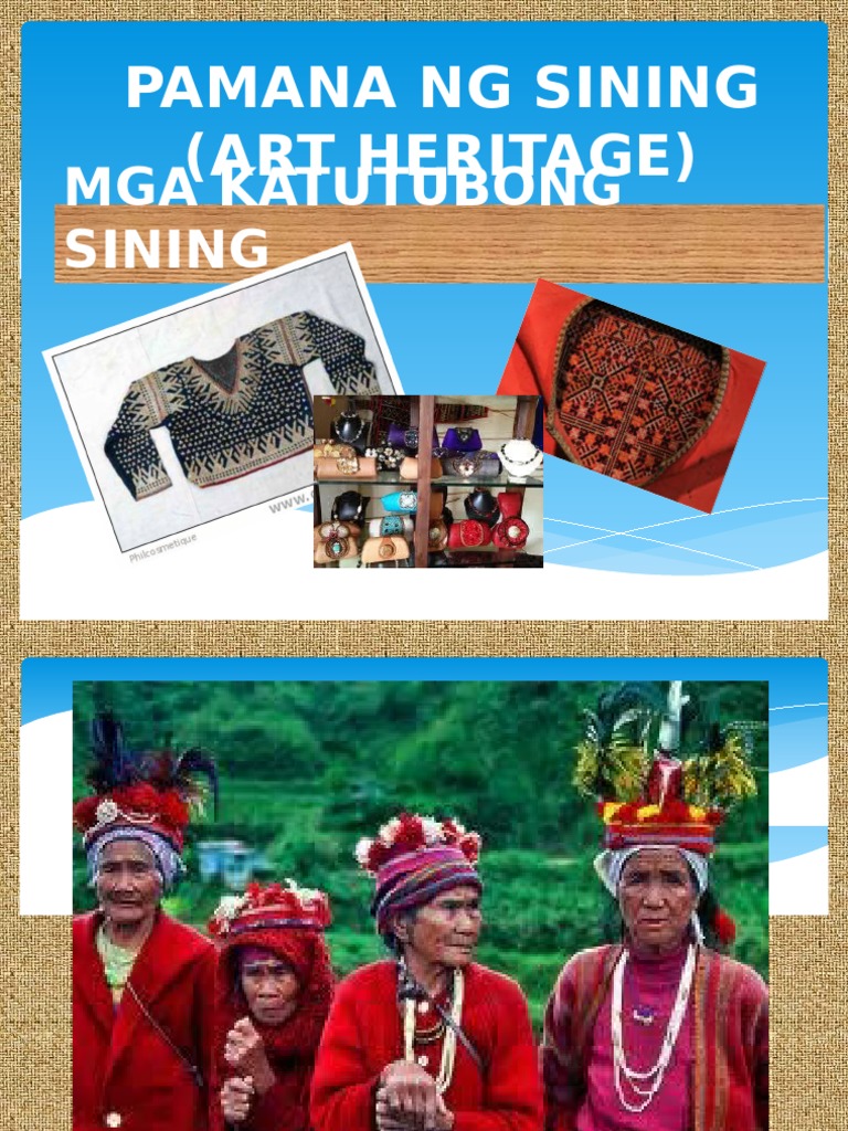 Mga katutubong sining bagay. Ipinaliwanag namin kung ano ang tanyag na sining at kung anong mga uri ng sikat na sining ang umiiral. Sa anong mga bagay maaaring gamitin ang ibat ibang uri ng pag-uulit ng mga disenyo sa isang likhang sining. BULUL Bul-ul ng Ifugao Mga Katutubong Sining Folk Art 2.